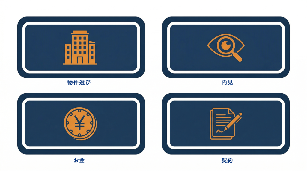 この記事では、中古マンション購入の注意点を「物件選び」「内見」「お金」「契約」の4つに分けて解説します。