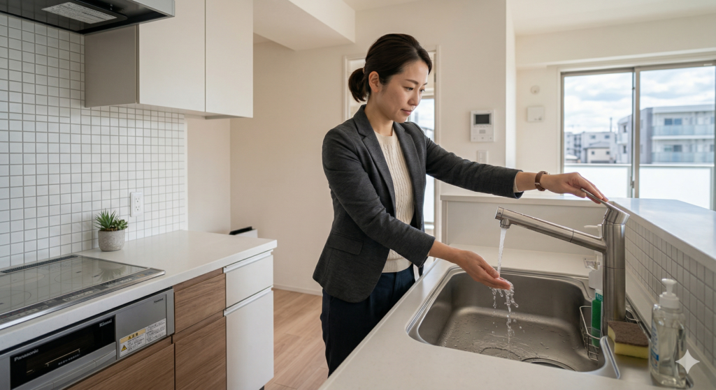 キッチン・浴室・トイレの蛇口をひねって水圧を確認してください。排水の流れもチェック。配管が古いと、入居後に水漏れトラブルが発生するリスクがあります。